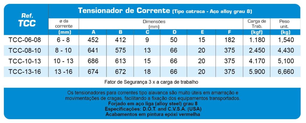 O tensionador de corrente é um equipamento de segurança utilizado para amarração de equipamentos e cargas durante o processo de transporte. É muito usado, principalmente, em